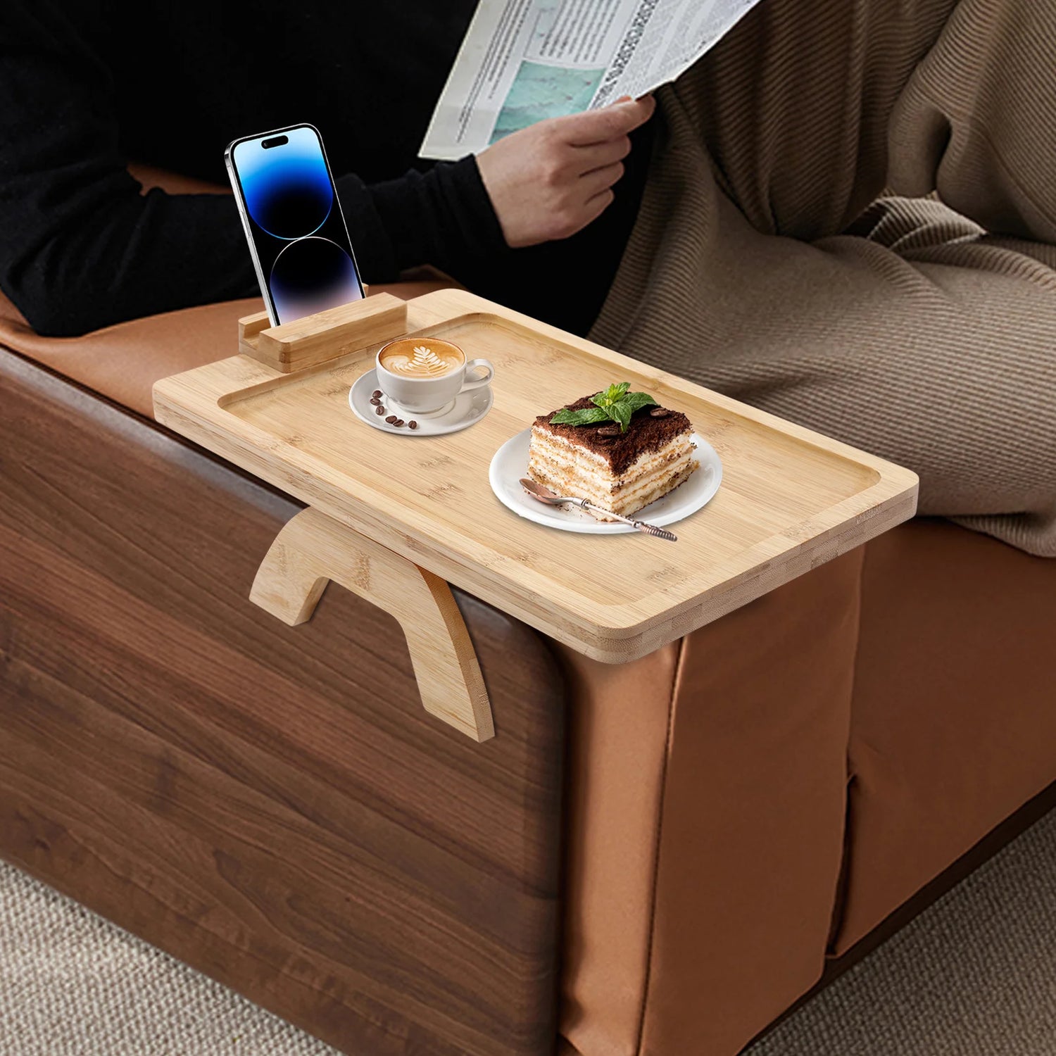 Bamboo Sofa Arm Tray – Clip-On Couch Table with Phone Holder in Black or Natural Wood